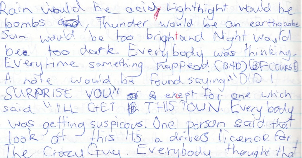 What I wrote back then is raw material. It doesn’t directly translate but can be used to build a foundation. A lot of content in my final Highton Heroes screenplays was never even evident in my school writings. And sometimes it’s just a small mention of something that becomes a main plot point in the Highton Heroes narrative. For example, take a look at this small extract: